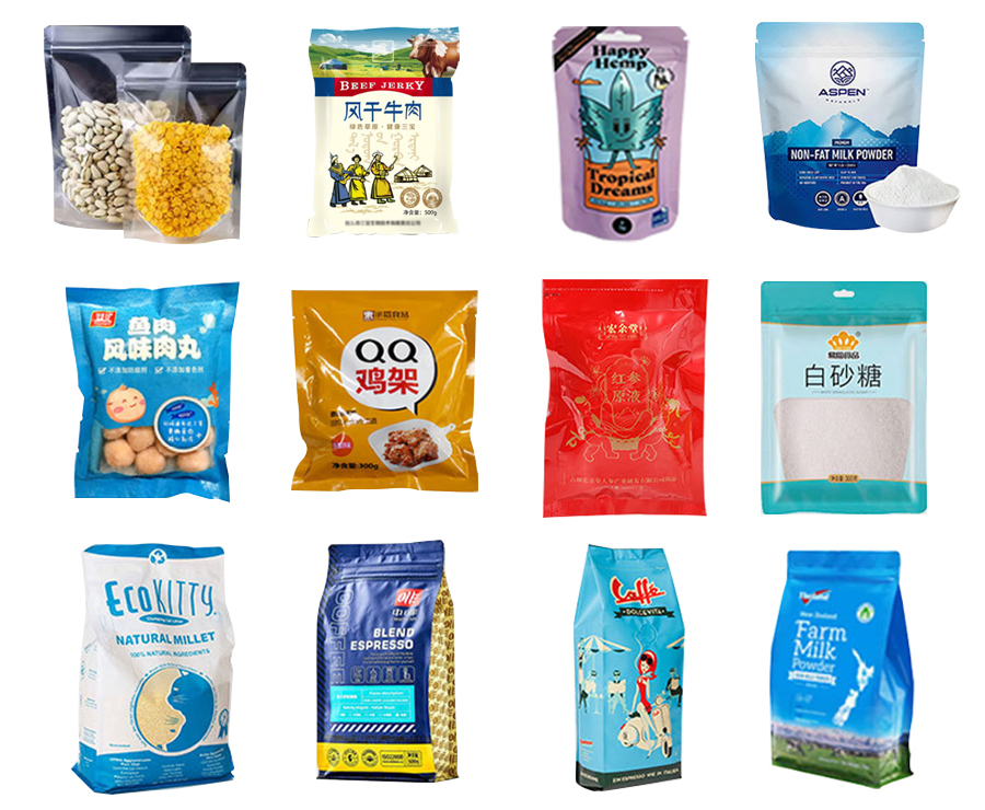 Bag packaging machine is suitable for weighing grain, stick, slice, globose, irregular shape products such as candy, chocolate, jelly, pasta, melon seeds, roasted seeds, peanuts, pistachios, almonds, cashews, nuts, coffee bean, chips ,raisins, plum, cereals and other leisure foods, pet food, puffed food, vegetable, dehydrated vegetables ,fruits, sea food, frozen food, small hardware, etc.