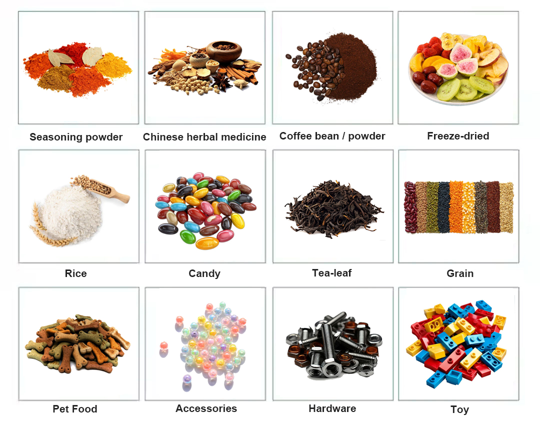 Smart packaging machine main functions:  automatic weighing, automatic packaging Suitable for weighing and packaging granular, powder,and strip packaged products such as grains, tea, flower tea,potato chips, popcorn, seasoning, flour, coffee powder,nut snacks, pet food, medicine,hardware accessories,screws, accessories, etc.